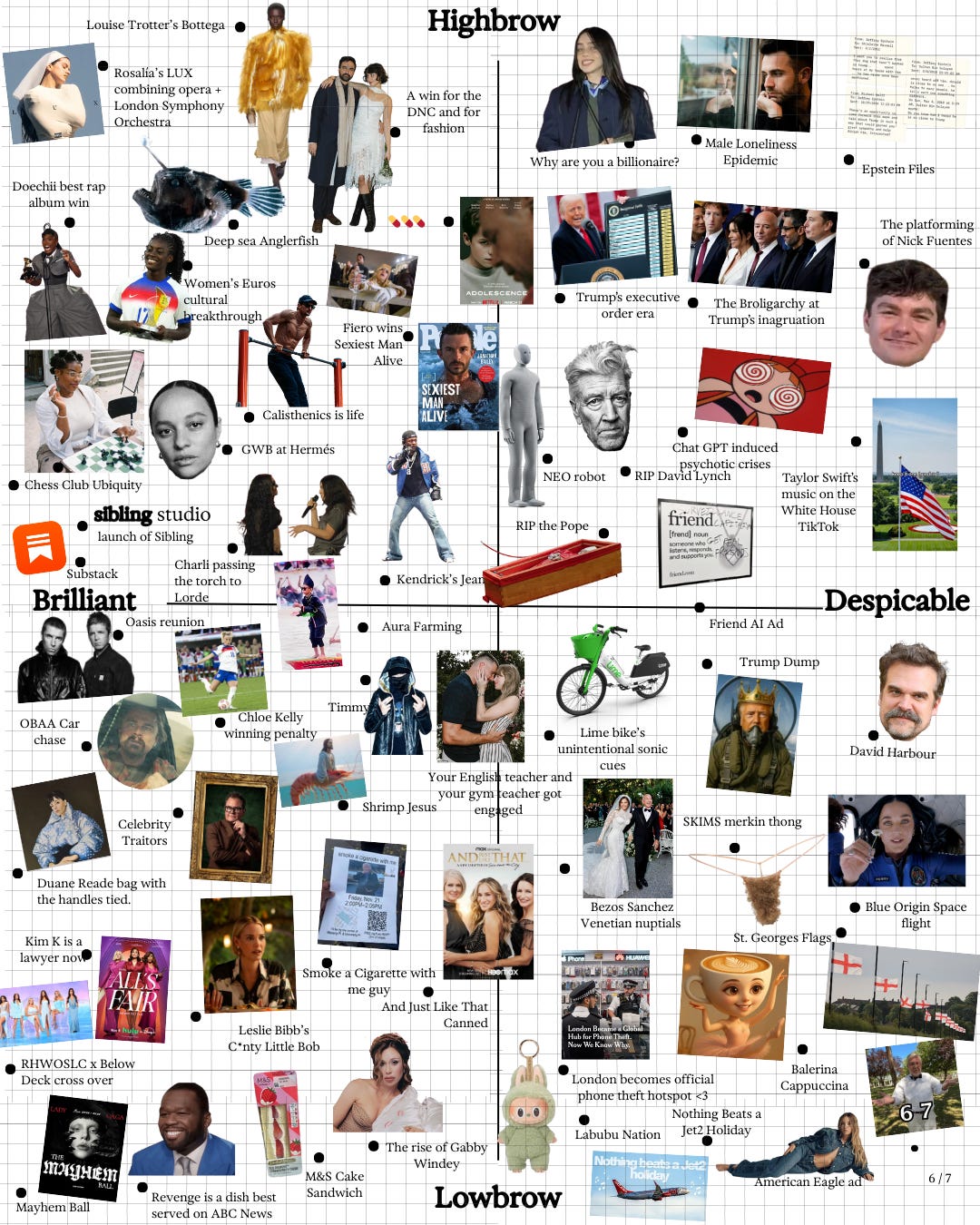 Welcome to our final Boston Matrix of the year. We were tempted to do a Boston Matrix mapping all of our Boston Matrixes but thought that might be a bit too gaze-y!! But we couldn’t end 2025 without pulling together the ultimate cultural matrix; mapping everything from the Labubu craze and the West End Girl shocker, to the frankly dystopian Katy Perry space trip, the fever dream of And Just Like That, Flag-Gate, Alan Carr winning Celebrity Traitors and much, much more.